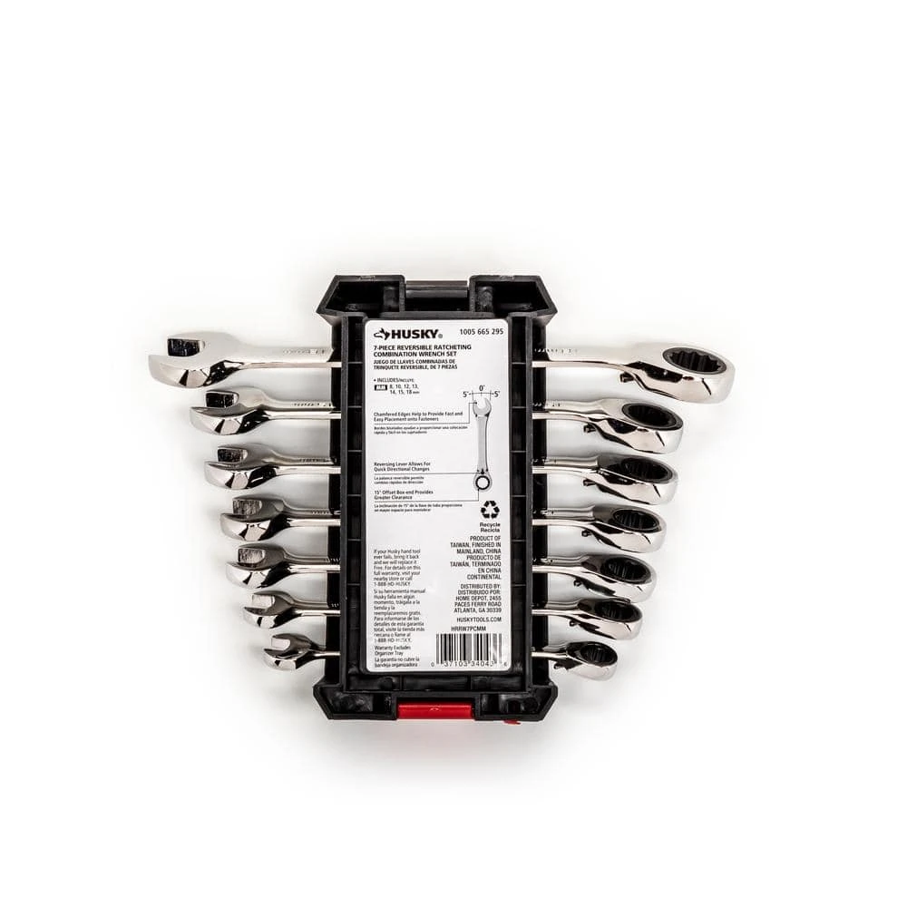 The Husky 7-Piece Metric Reversible Ratcheting Wrench Set is constructed of alloy steel for strength and long-lasting performance. The flush-mounted reversing lever allows access in tight spaces. The full polish chrome finish helps protect the wrench for rust and corrosion.