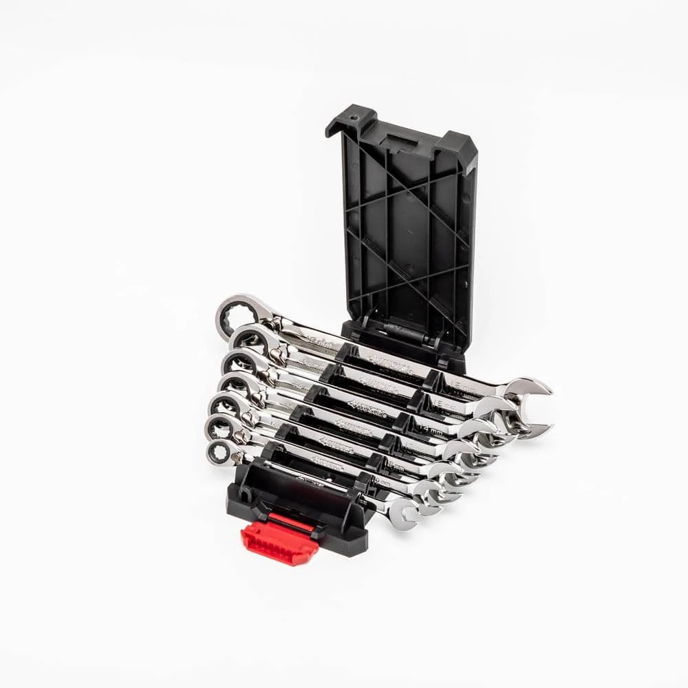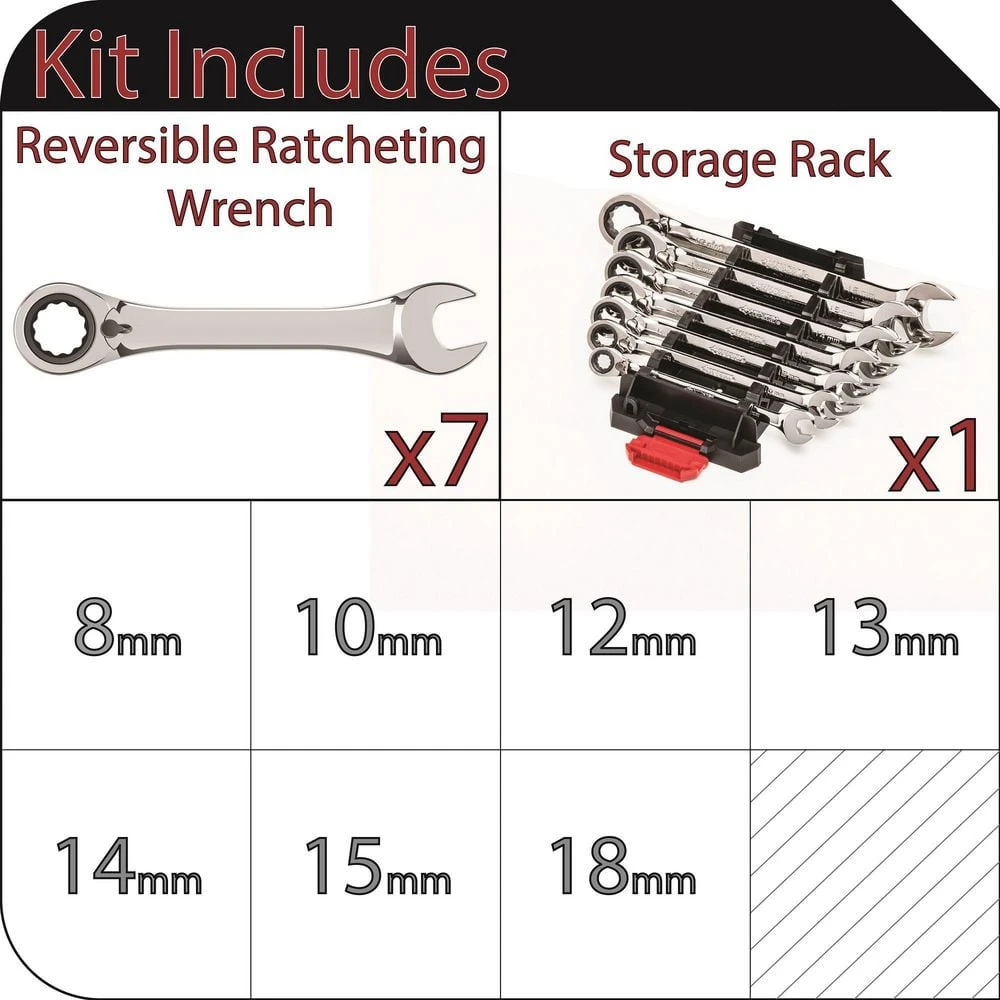 - 7-piece set includes reversible ratcheting wrenches covering sizes 8mm, 10mm, 12mm, 13mm, 14mm, 15mm, and 18mm