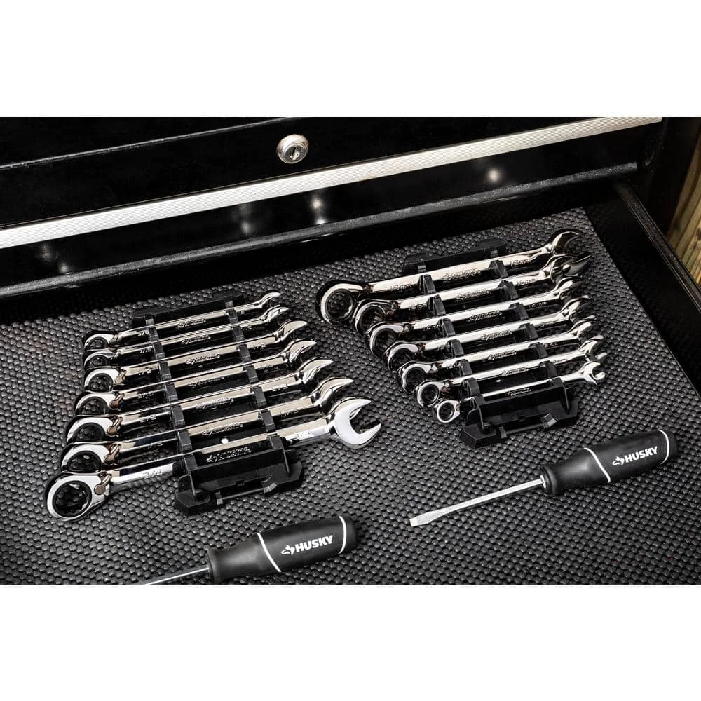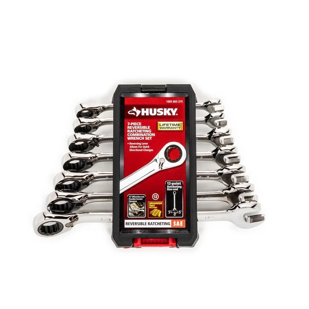 The Husky 7-Piece SAE Reversible Ratcheting Wrench Set is constructed of alloy steel for strength and long-lasting performance. The flush mounted reversing lever allows access in tight spaces. The full polish chrome finish helps protect the wrench for rust and corrosion.