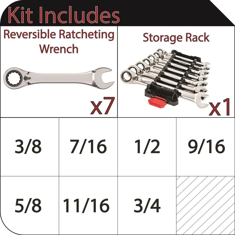 - Set includes 7 reversible ratcheting wrenches covering sizes 3/8 in., 7/16 in., 1/2 in., 9/16 in., 5/8 in., 11/16 in., 3/4 in.