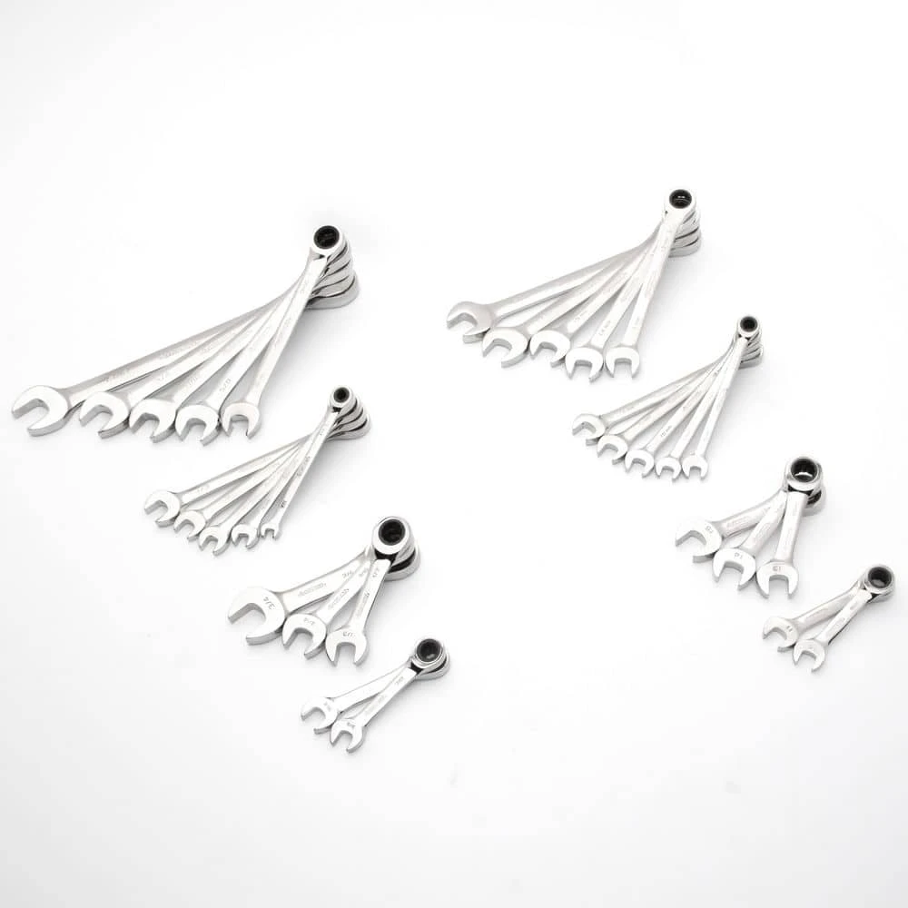 - Set includes 20 standard 12-point ratcheting wrenches SAE sizes 1/4