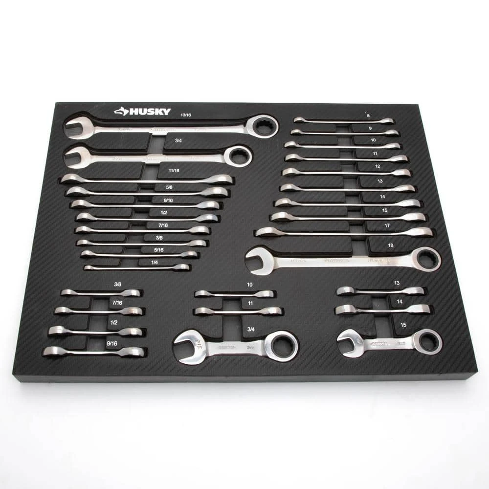 The SAE and Metric Ratcheting Wrench Set in EVA Tray includes 30 ratcheting combination wrenches (20 standard and 10 stubby) conveniently stored in an EVA foam storage tray to keep your wrenches organized inside your toolbox. Husky Ratcheting Wrenches feature a 12-point design pattern to help prevent fastener damage and increase torque. A durable, polished chrome finish provides corrosion resistance for a lifetime of use while an alloy steel construction provides long-lasting performance. Wrenches have box-end design for additional leverage and to prevent slipping on hard-to-remove fasteners. Ratcheting box end needs only a 5° arc to turn a fastener, making hard-to-reach areas more accessible.