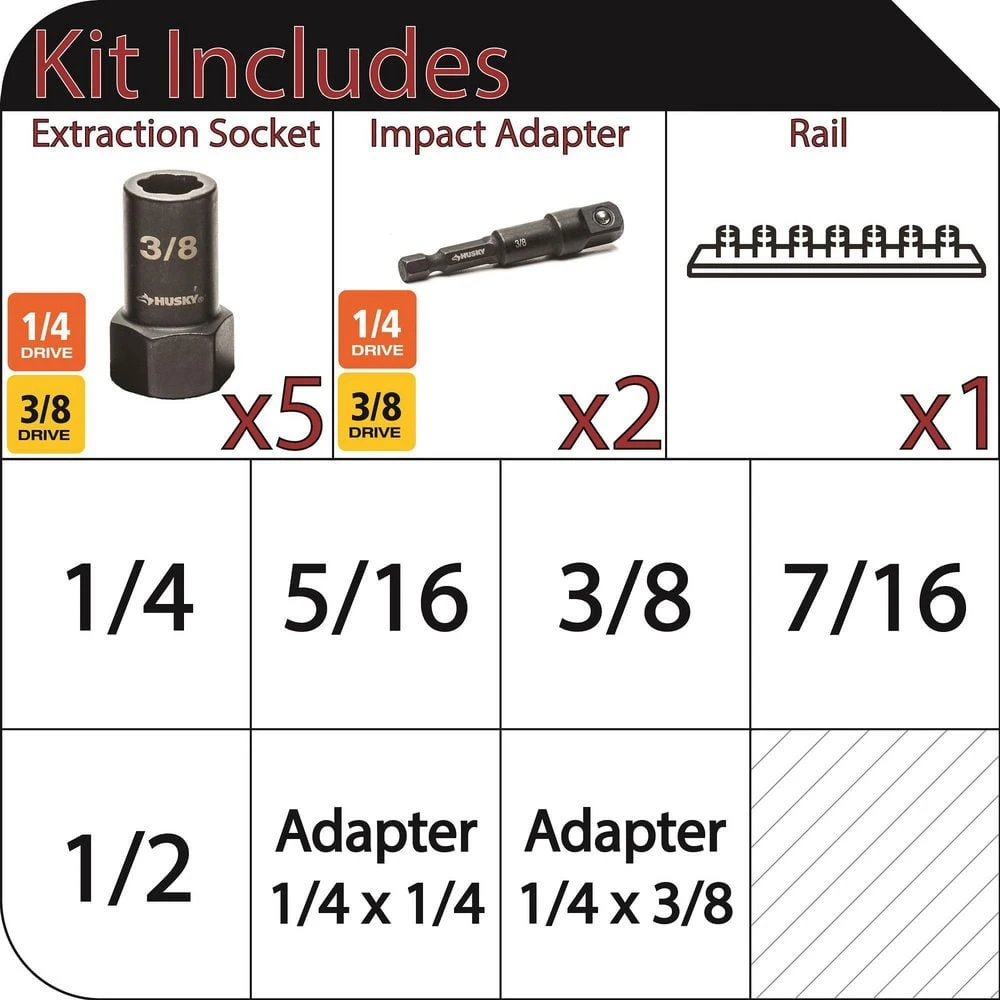 - 7-piece set includes extraction sockets in SAE sizes 1/4 in., 5/16 in., 3/8 in., 7/16 in., and 1/2 in., and 2 impact adapters in 1/4 in. and 3/8 in.