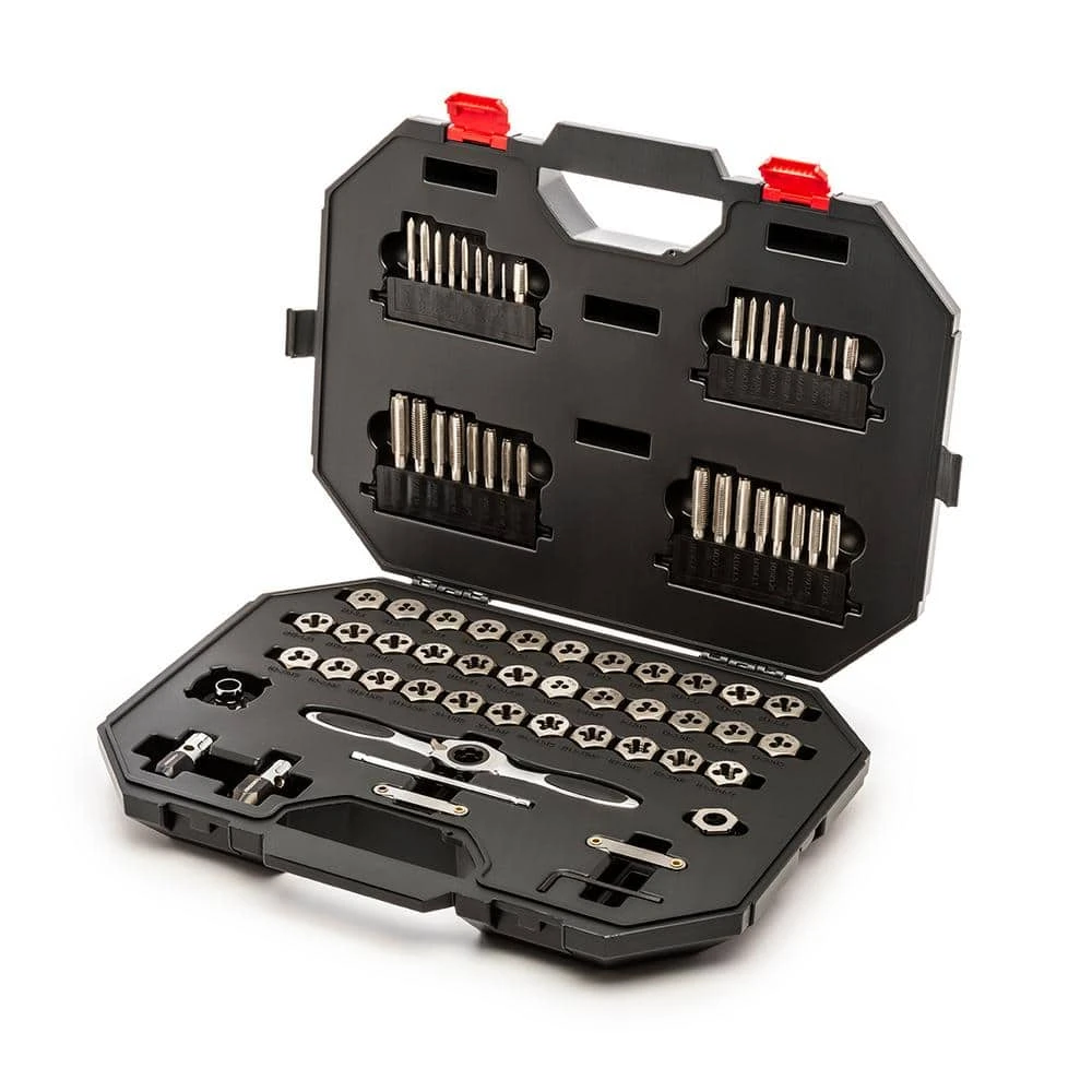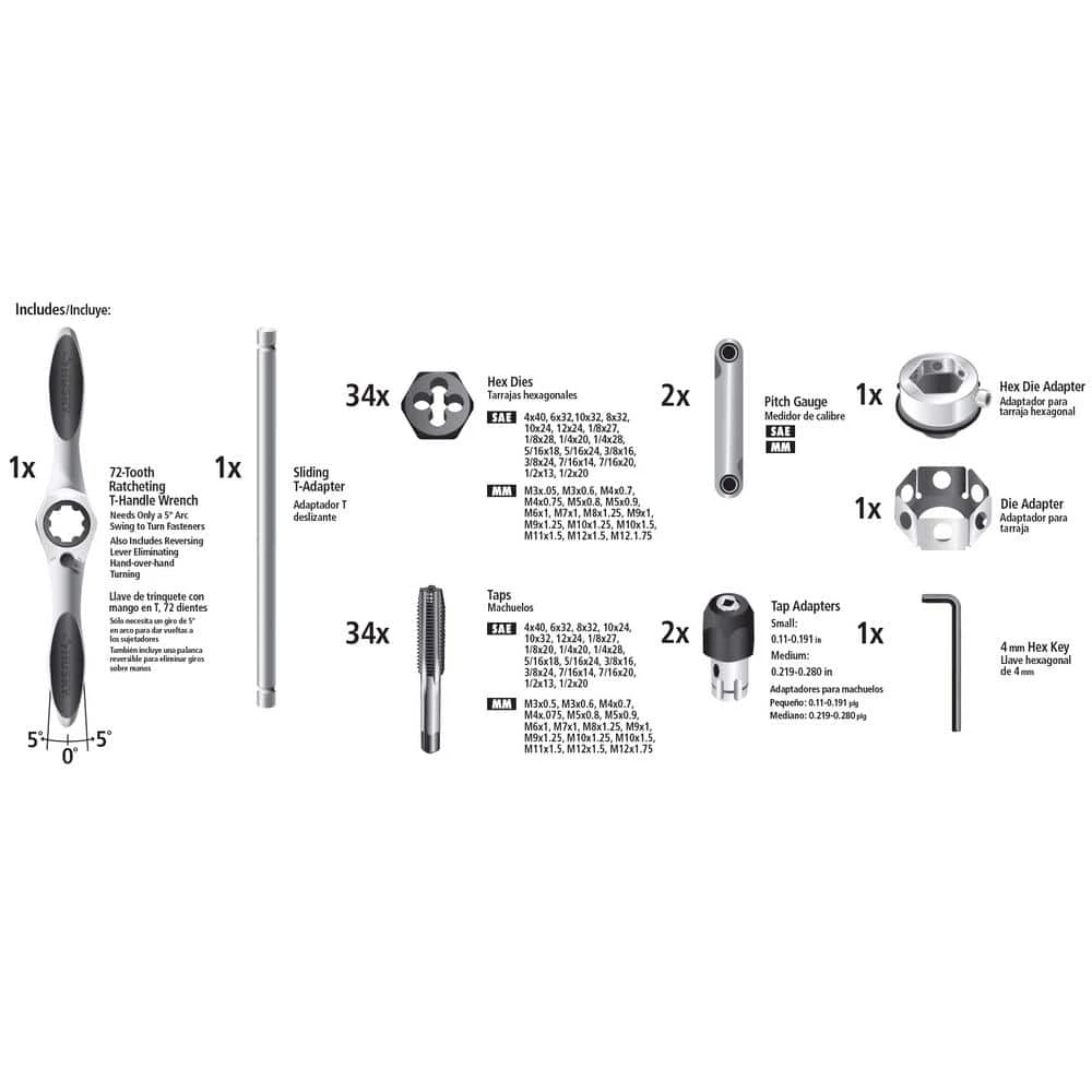 - Set includes a 72-tooth ratcheting T-handle, a sliding T-adapter, 34 hex dies, 34 taps, 2 pitch gauges (SAE & Metric), small tap adapter (0.11-0.191 in.), medium tap adapter (0.219-0.280 in.), 2 die adapters and a 4 mm hex key