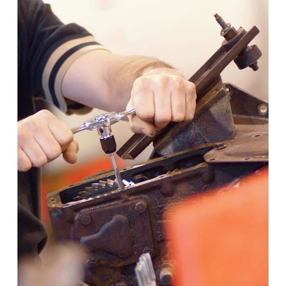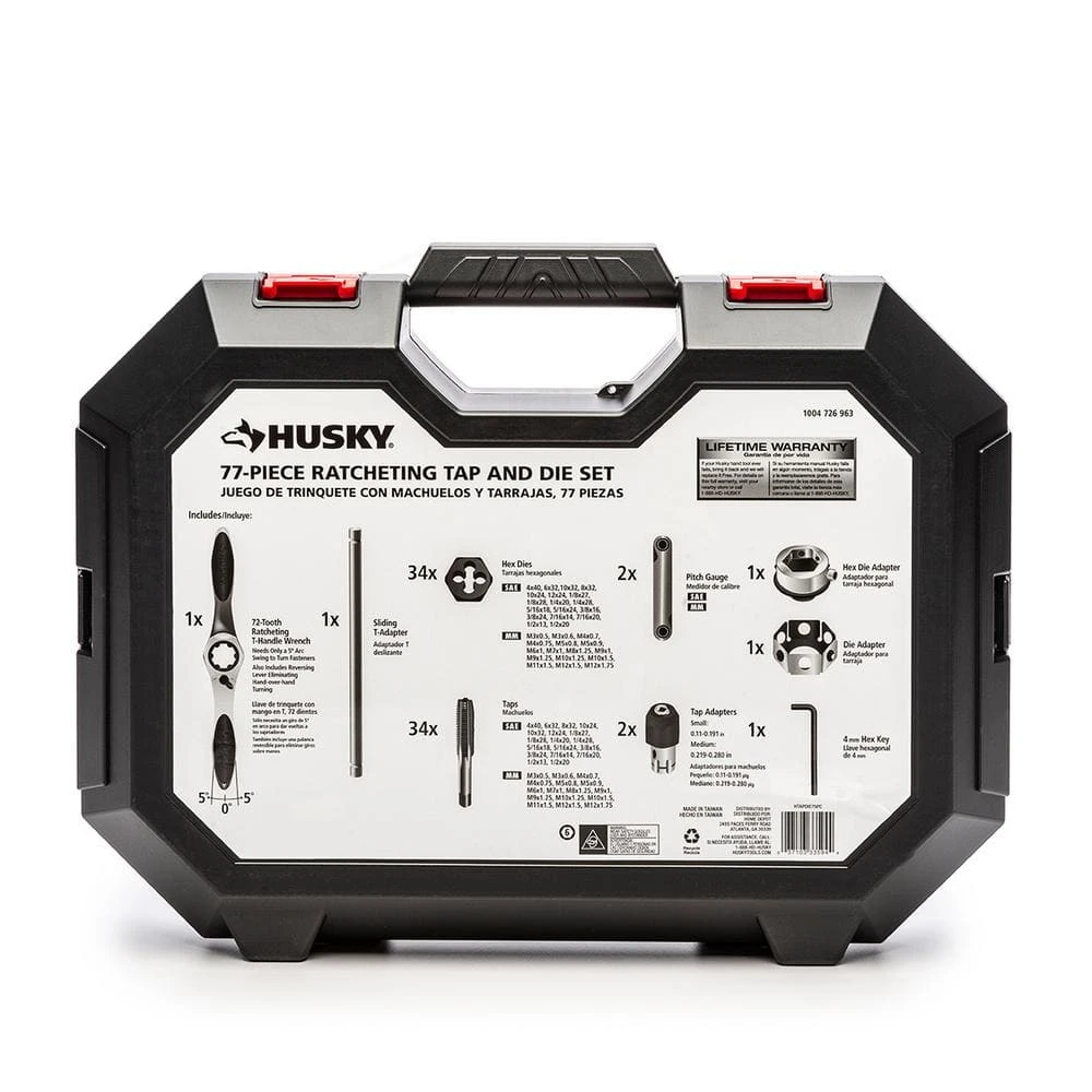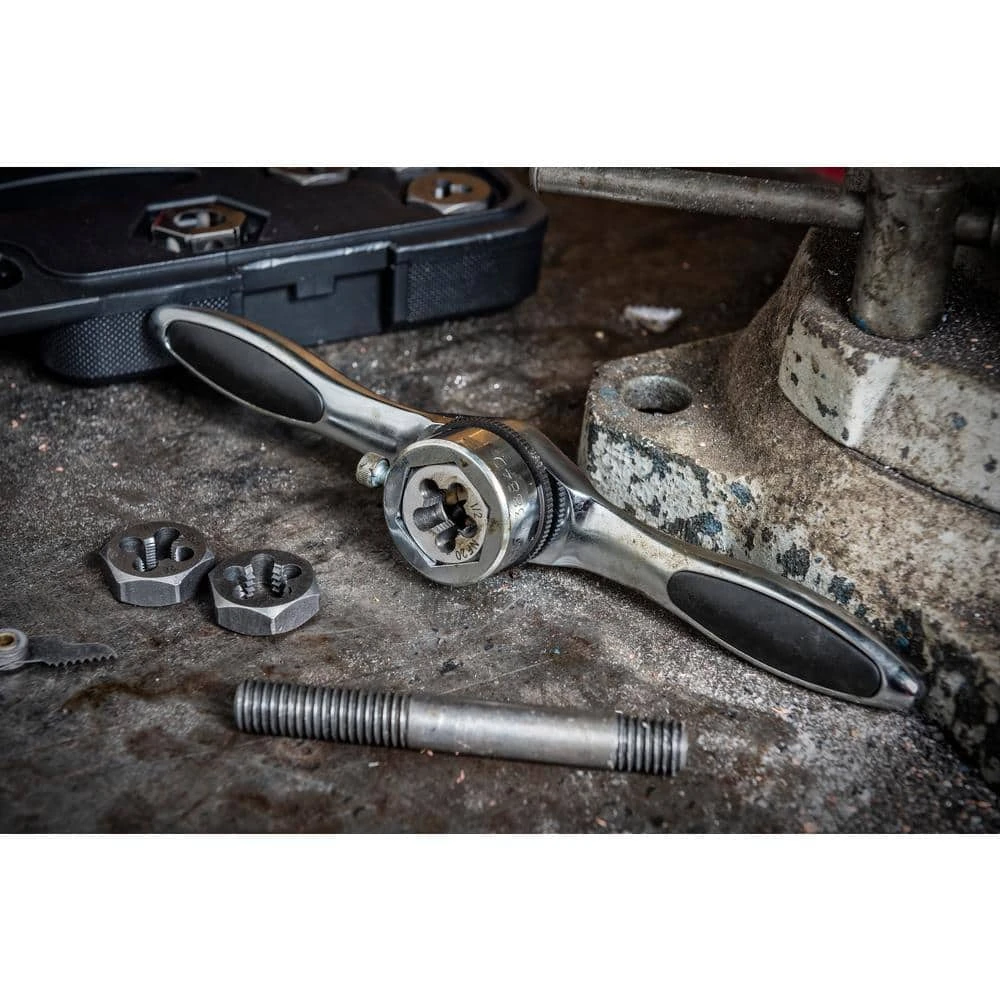 Husky has taken the ratcheting wrench design and applied it to the tap and die application. The ratcheting handles and adapters allow for easy back and forth movement required while cutting threads on either taps or dies. The 5 ratcheting arc with reversing lever eliminates hand over hand turning. The hex die adapters work on either round or hex shaped dies.