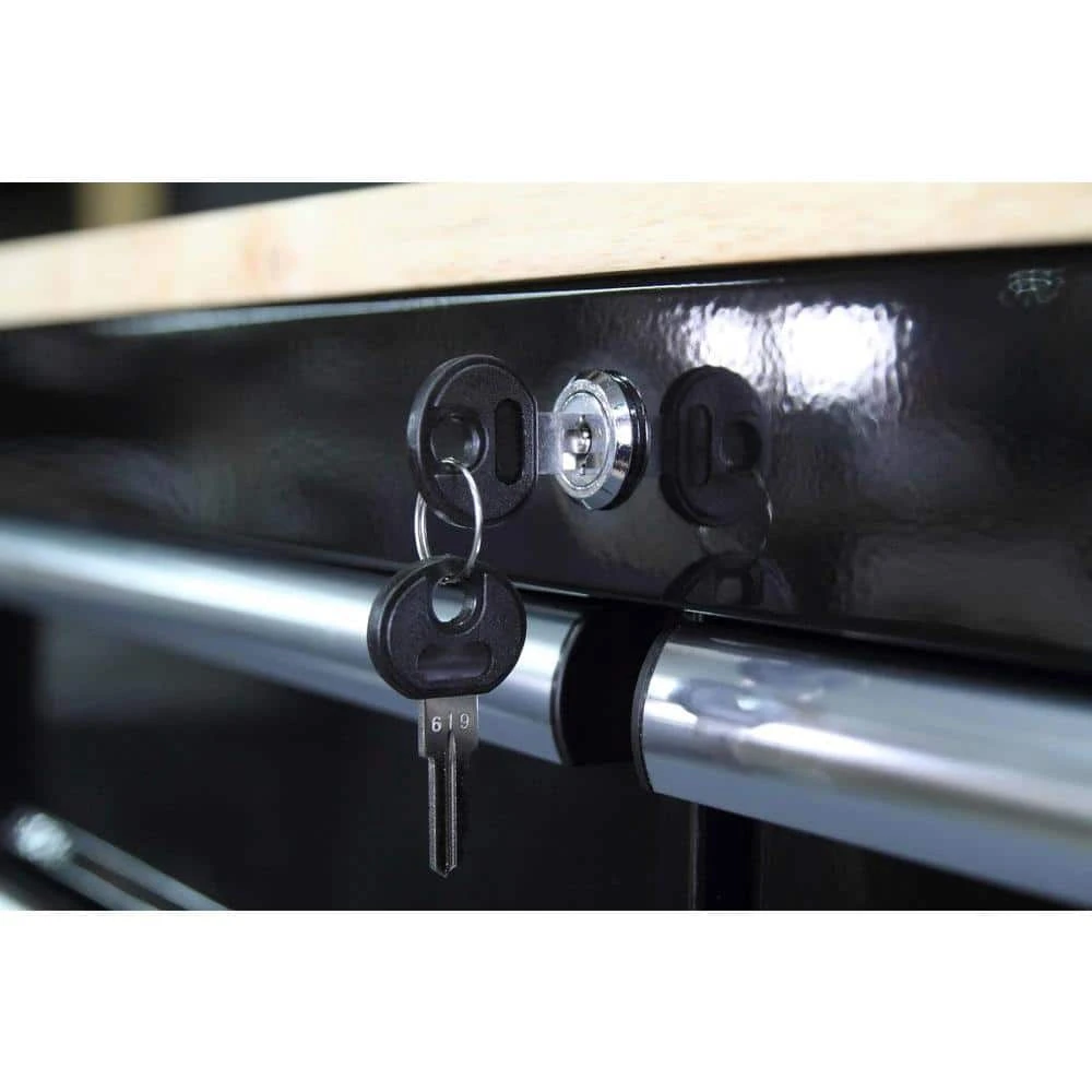 - Solid wood top with a protective coating (Note: the wood top is affixed to the tool cart frame and does not open)
