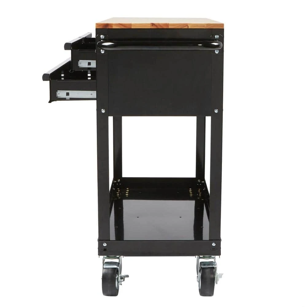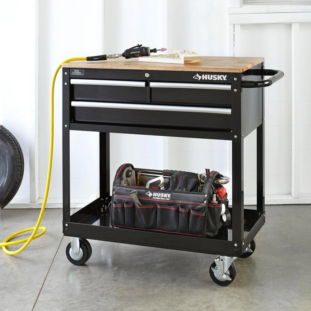 The Husky 36 in. 3-Drawer Tool Cart is the perfect combination of a mobile work center and a mechanic’s tool cart. The fixed wood top is made of solid para-wood, which provides a durable work surface that is both stylish and practical. The 3 drawers have 50 lbs. rated ball bearing slides to hold a variety of tools. The bottom storage tray is reinforced steel for your larger, heavier items. The large, push bar handle and heavy-duty, 5 in. x 2 in. casters allow this cart to be easily moved around your garage, shop, hobby room or office. With no clumsy washers and nuts to deal with, this tool cart can be assembled in minutes with the included bolts and pre-installed speed nuts.