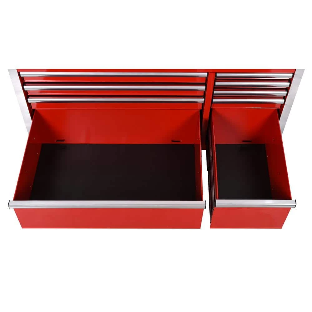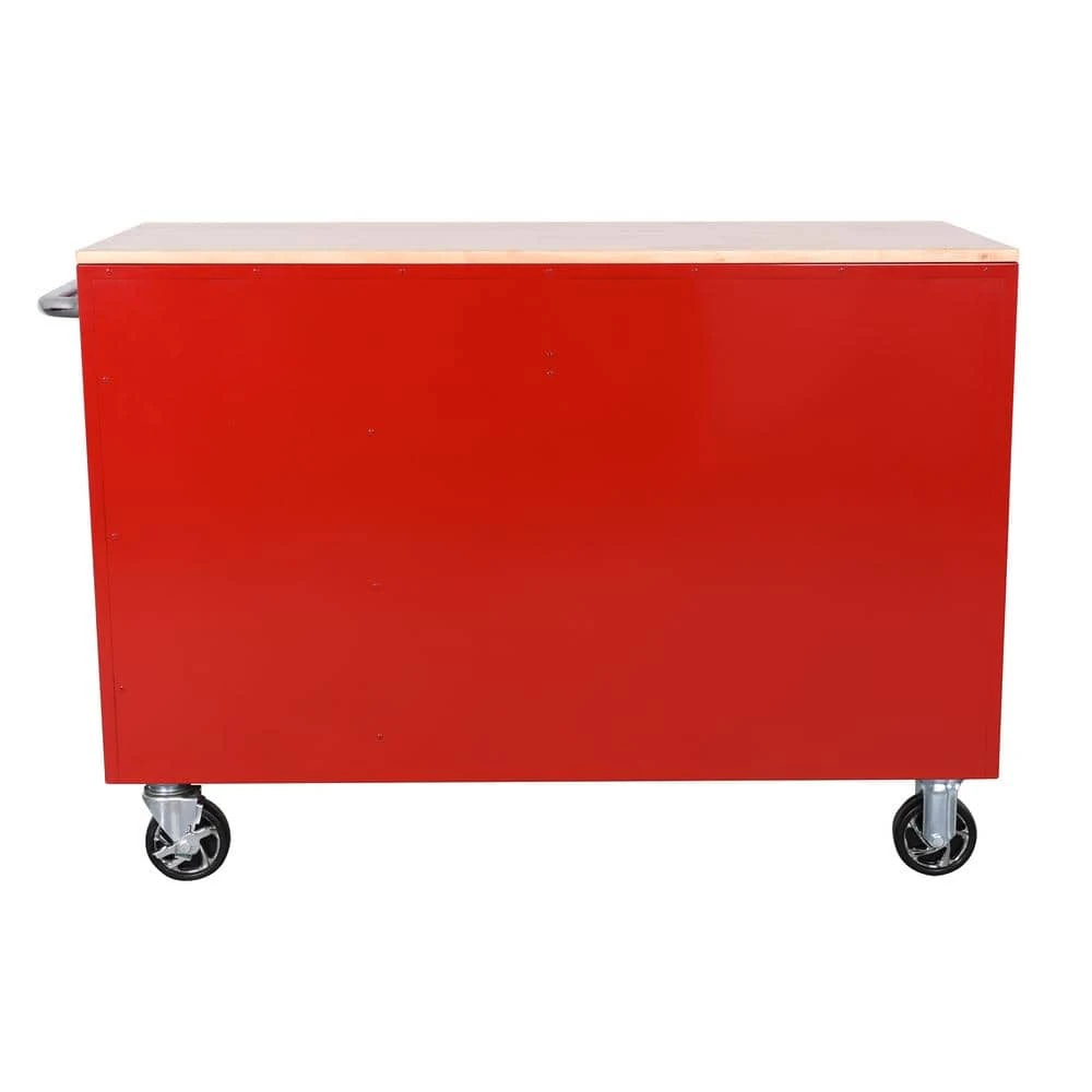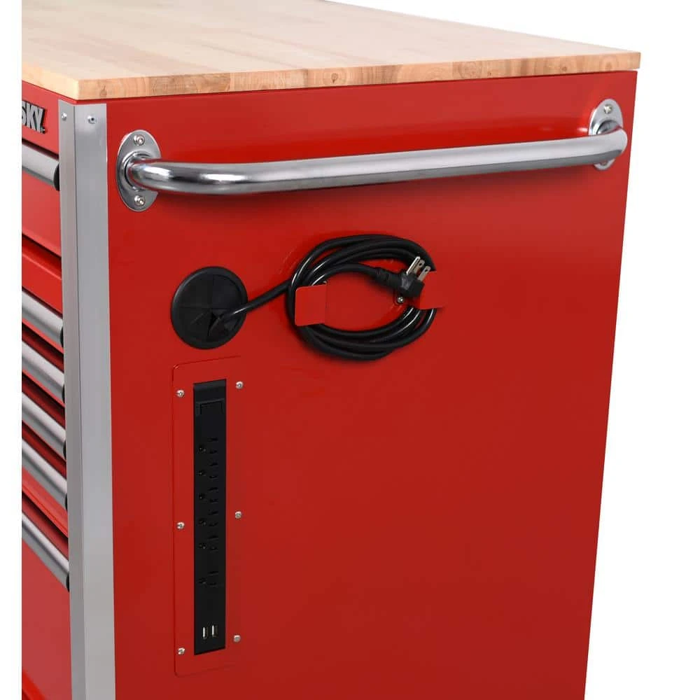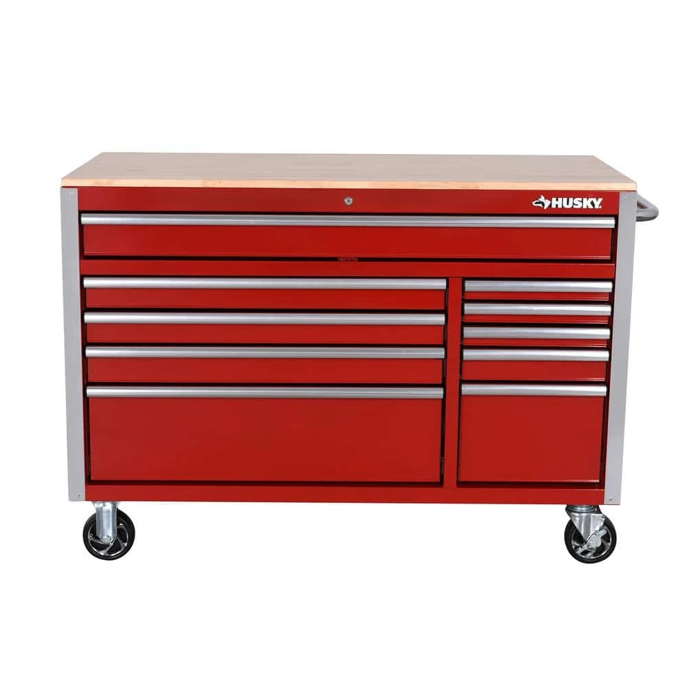 The Husky 52 in. W x 24.5 in. D 10-Drawer Red Out Mobile Workbench with Solid Wood Top is here. This workbench is constructed of 21-Gauge steel and has a large wood surface for all your projects. The 10-drawers combine for 22,616 cu. in. of storage space. All drawers glide effortlessly on 100 lbs. rated ball-bearing slides. These slides are also equipped with a soft-closing mechanism that prevents your drawers from slamming shut. Each drawer also has a pre-cut liner inside to help keep your tools in place. On the side of the workbench is an integrated power strip that has 6 outlets and 2 USB ports. Storage hooks are available when cord is not in use. Finally, there are 5 in. x 2 in. casters and a push handle that will allow you to move the workbench around your work space with ease.