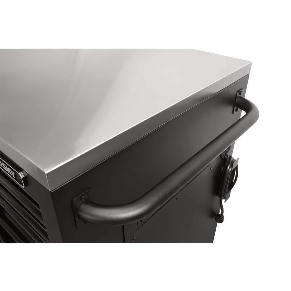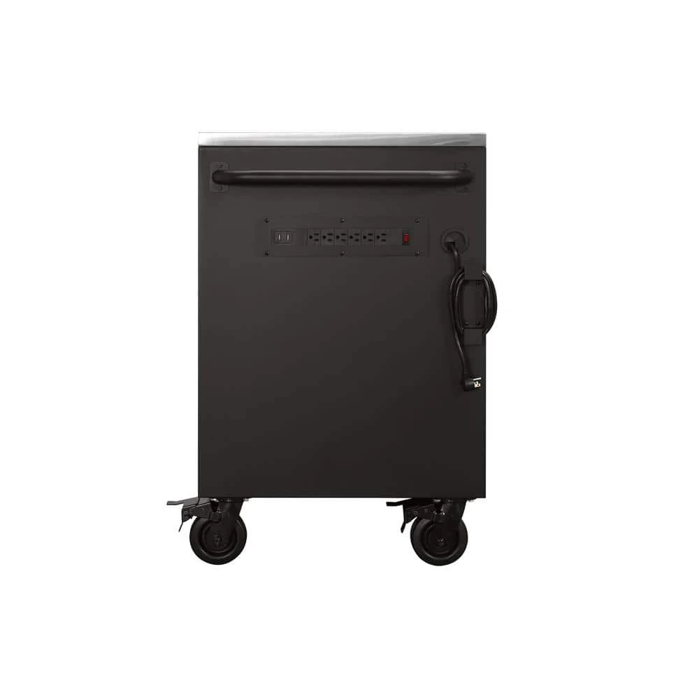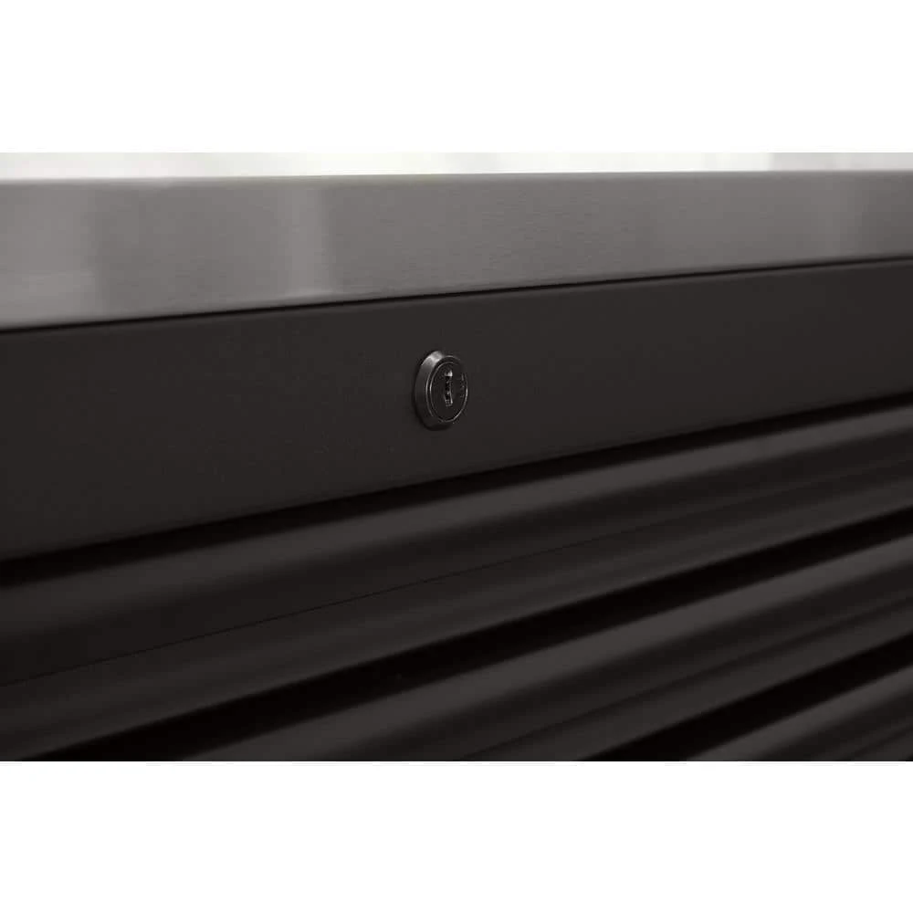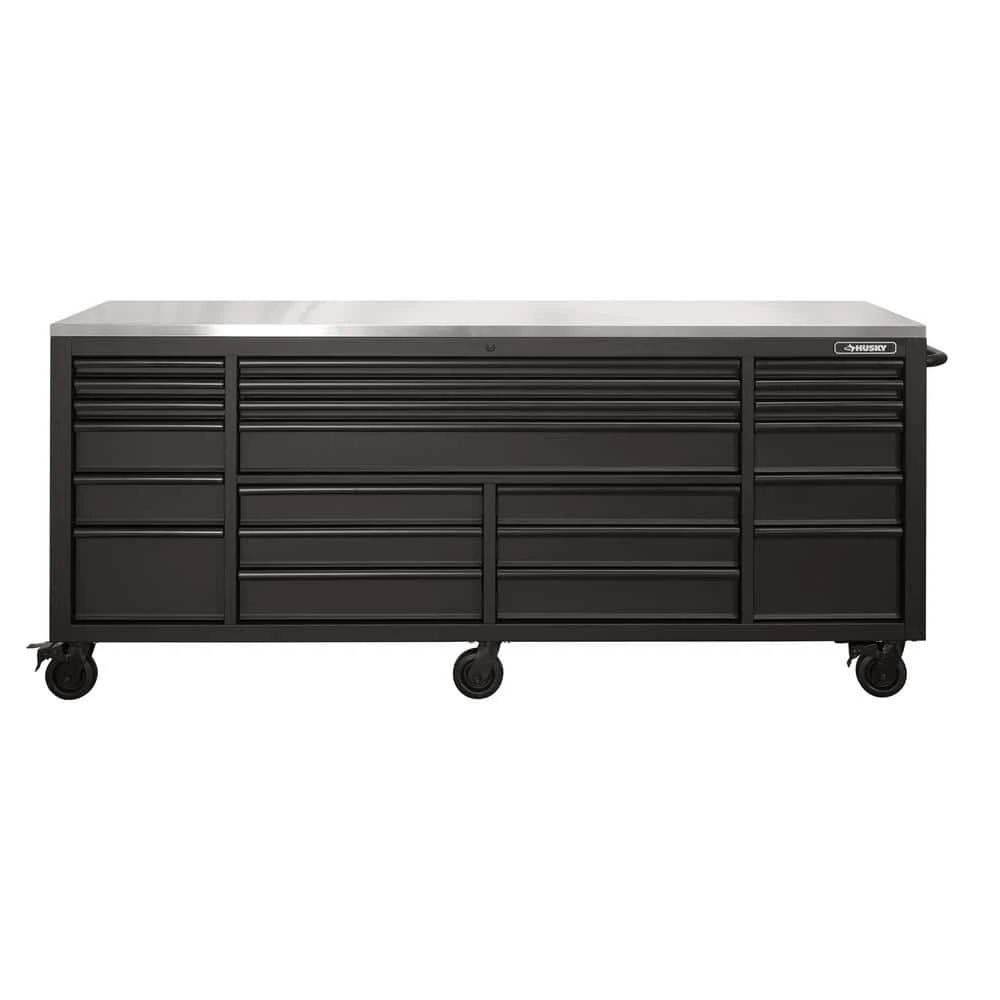 The Husky Heavy-Duty 84 in. 22-Drawer Mobile Workbench with Stainless Steel Work Top is a tool cabinet that combines the perfect blend of drawer storage capacity and functional work surface area for the tool enthusiast. This rolling tool cabinet has heavier 19-Gauge steel. This workbench is 24 in. D, which is 6 in. deeper than most standard rolling tool cabinets, providing more usable storage space that is strong enough to support 3,800 lbs. and has 36,608 cu. in. capacity. Charge your power tools with the 2 built-in, 6-outlet, 2 USB power centers. The 120 lbs. rated, soft-close drawer slides keep the drawers from accidentally opening or from slamming shut. Drawer liners are included to protect and keep your tools in place. This mobile work center has 6 large, 6 in. x 2 in. all swivel casters and a steel tubular side handle, which allow you to easily move around, even when fully loaded. This unit comes with pre-installed casters.