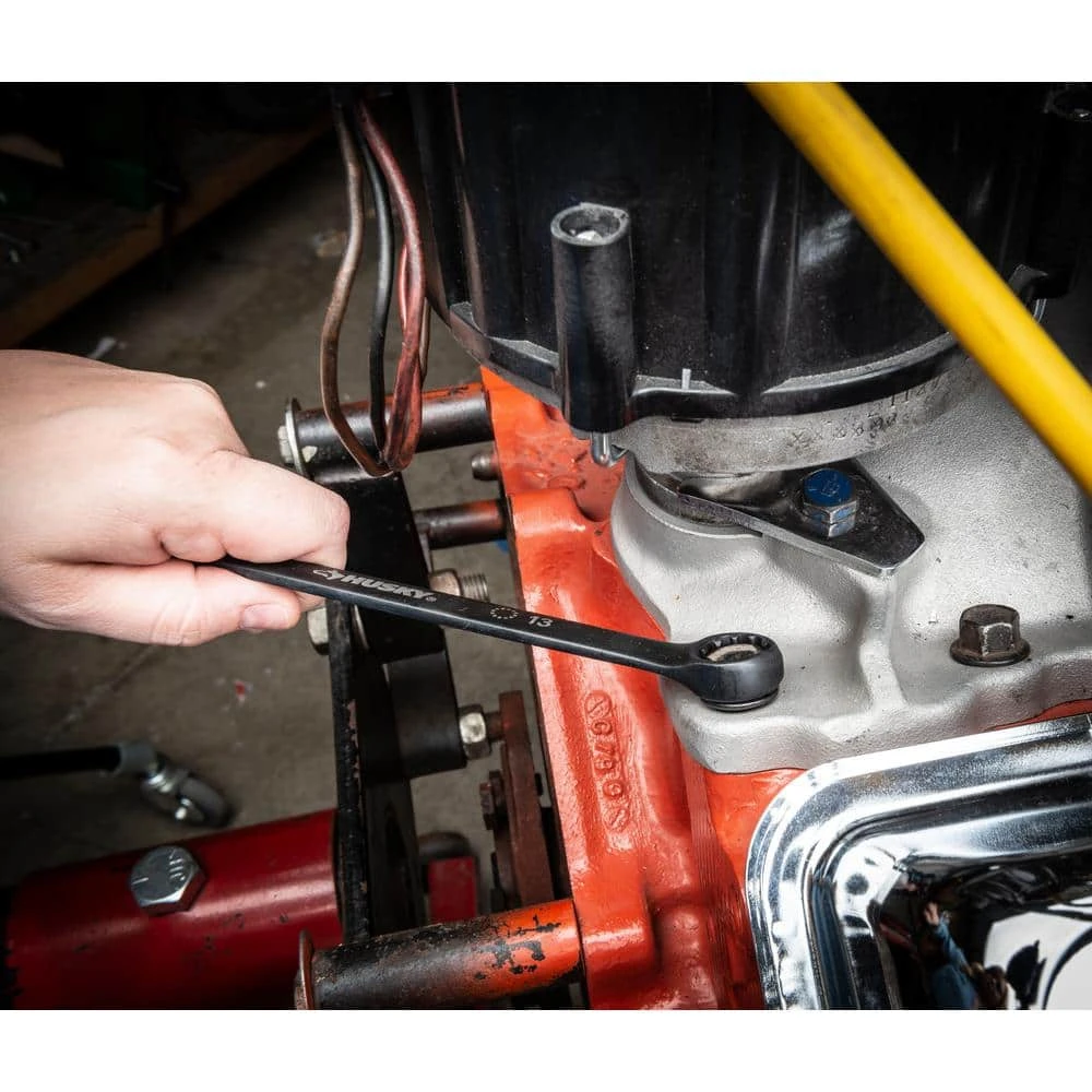 The New Husky Universal Combination Wrenches with Surface Grip technology allow you to get tough jobs done. These wrenches feature an innovative Surface Grip open-end design that grips fasteners on the flats rather than the corners. This feature helps to prevent rounding and damage to the fasteners while generating up 80% more grip than a standard open end wrench. Each long pattern wrench is 10% longer than standard Husky wrenches providing better access to hard to reach fasteners. The added length also allows for increased leverage to be applied to the fastener making it easier to break free hard to remove nuts and bolts. The universal box-end is designed to be used on 6 different styles of fasteners. Husky Black Surface Grip wrenches offer better grip, better access, more torque and more leverage which makes them a great addition to any toolbox.